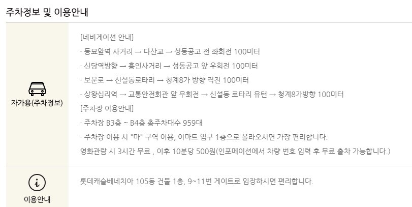 주차장 이용요금의 경우 당일 영화 관람 시 3시간까지 무료주차를 제공합니다.