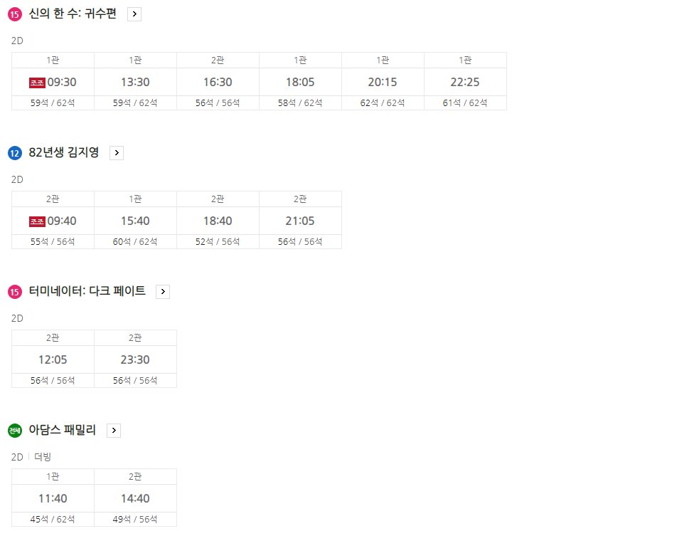황학 롯데시네마 상영시간표를 살펴보면 오늘 하루 총 4편의 영화가 상영 중으로 소개되고 있습니다.