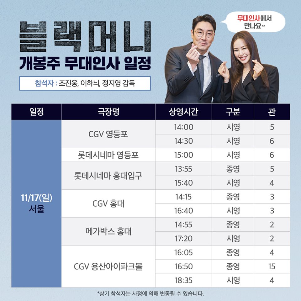 11월 17일(일) 블랙머니 무대인사는 14시부터 CGV 영등포, 롯데시네마 영등포, 롯데시네마 홍대입구, CGV 홍대, 메가박스 홍대, CGV 용산 아이파크몰 등 6곳에서 진행이 될 예정이다.
