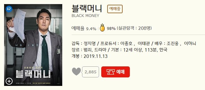 조진웅, 이하늬 주연의 블랙머니는 한국인들이 가장 좋아하는 장르의 범죄 드라마 장르로 영화 상영시간은 113분이다.