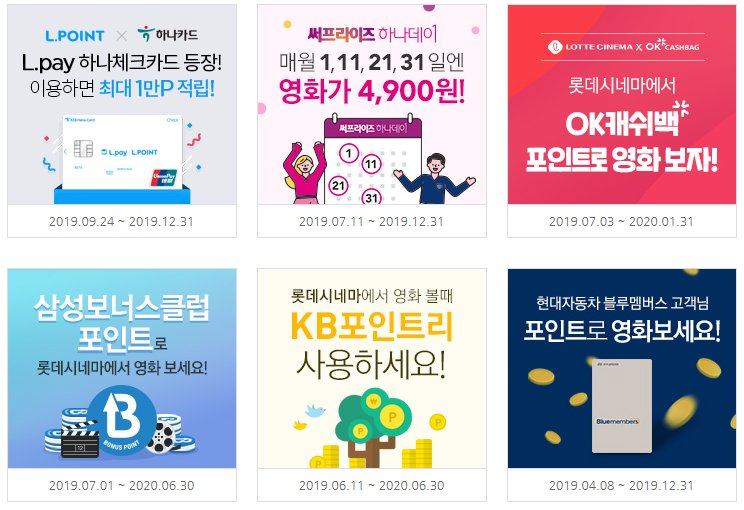 이밖에도 롯데시네마 홈페이지에 들어가면 L.POINT, OK캐시백, 삼성 보너스 포인트, 현대자동차 블루멤버스 포인트 등 다양한 포인트를 통해서도 영화관람권 결제가 가능하기 때문에 이러한 부분을 활용하시는 것도 좋을 것 같습니다.