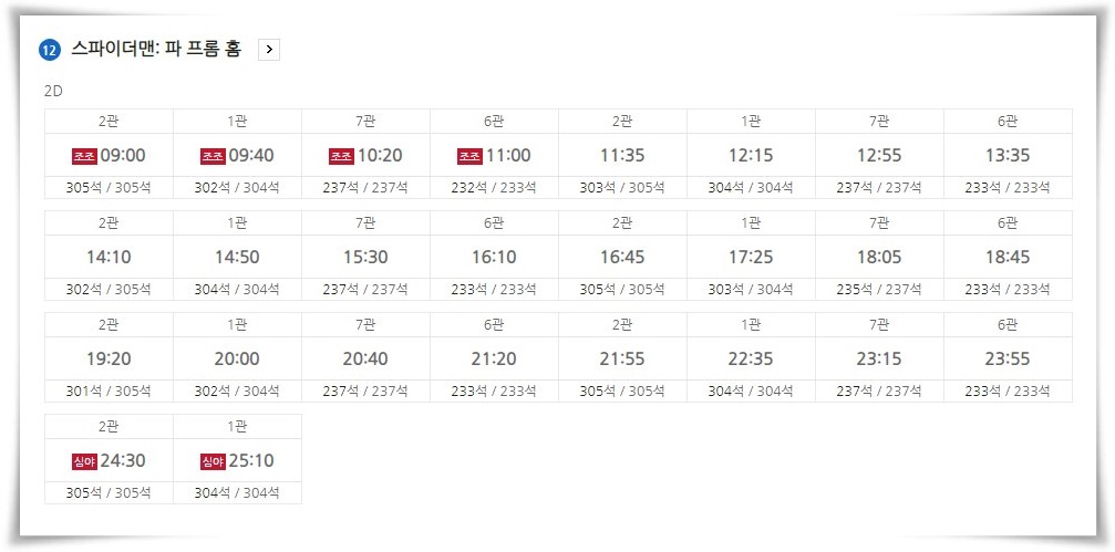 평일임에도 불구하고 화요일인 오늘의 상영시간표를 살펴보면 총 26번의 상영이 예정된 것을 확인할 수 있습니다.