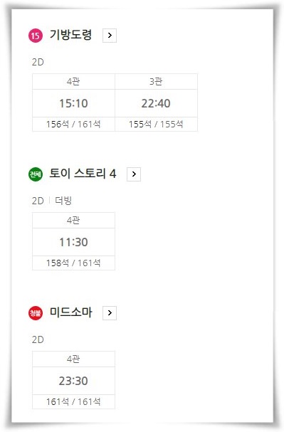 어린이들이 보기에 좋아할 만한 영화인 토이스토리 4도 현재 상영 중입니다. 아이들과 함께 극장 나들이하는 것도 좋을 것 같습니다.