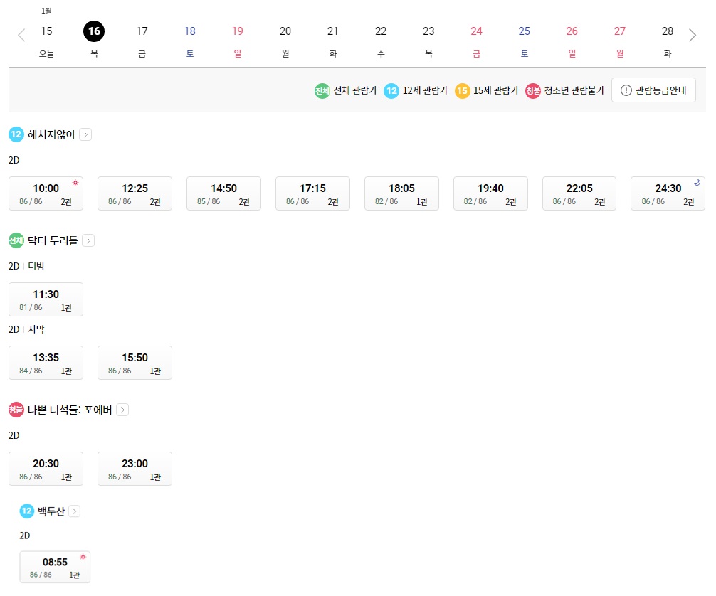 오늘 기준 마석 롯데시네마 상영시간표입니다. 총 4편의 영화가 상영 중으로 소개되고 있습니다. 매일마다 영화 상영시간표가 변경되는 만큼 관람 일자별 시간표는 롯데시네마 마석점 홈페이지에서 확인하시기 바랍니다.
