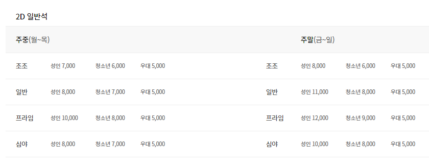 2D 영화 3D 영화에 따라서 가격차이도 있지만 좌석에 따른 영화요금도 차이를 보이고 있는 점 참고하시기 바랍니다.