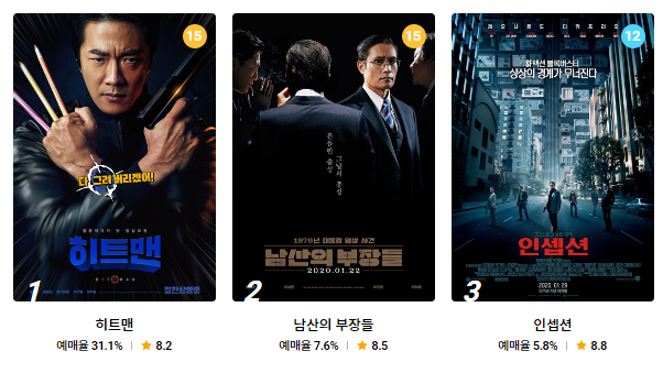 롯데시네마 예매순위를 살펴보면 히트맨, 남산의 부장들, 인셉션 순으로 예매율을 보이고 있습니다.