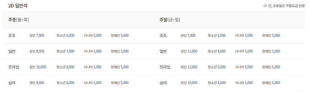 주중, 주말에 따라 다르며, 3D 영화, 좌석에 따라서 요금이 다른점 참고하시기 바랍니다.