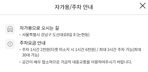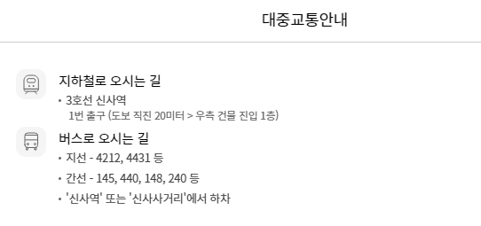 신사역과도 거리가 멀지 않기 때문에 지하철 혹은 버스를 활용하시는것이 좋을것 같습니다.