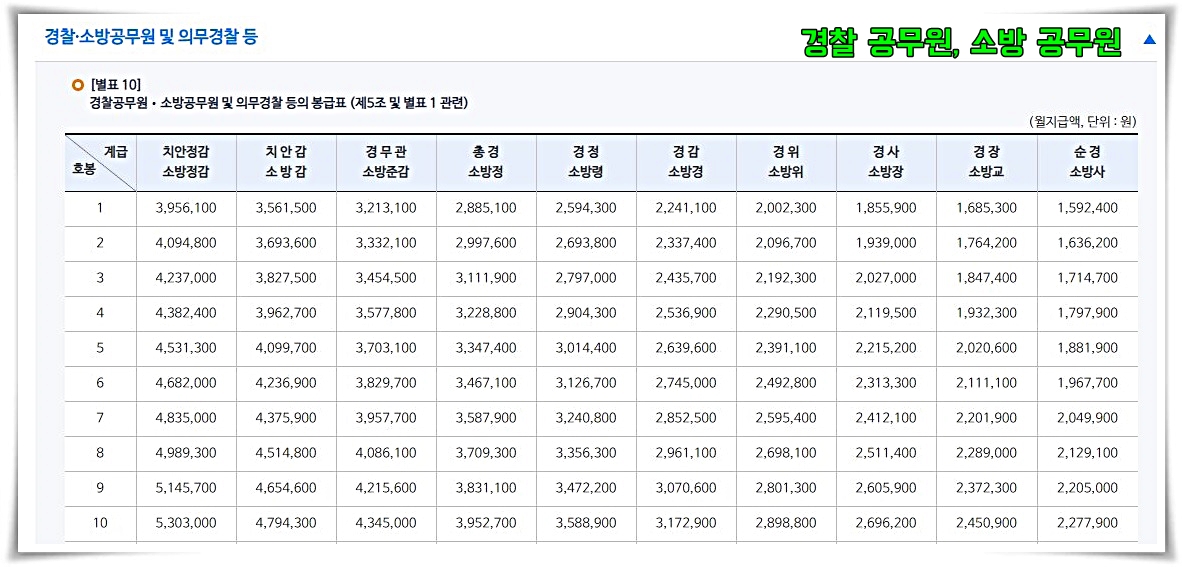 같은 공무원들이라고 해도 경찰공무원, 군인 공무원, 소방공무원, 교직원, 일반 공무원 등에 따라 기본급의 차이는 다르기 마련이다. 공무원 급여표는 첨부한 사진들을 참고하기 바란다.