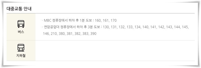 대중교통을 이용하시는 경우 mbc 정류장 역에서 하차하시면 쉽게 찾아올 수 있습니다. 특히 주말의 경우 주차장이 많이 혼잡하다고 하니 가급적이면 대중교통을 이용하는 것이 좋습니다.