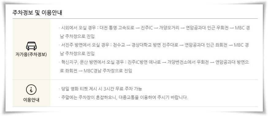 엠비씨네 진주 롯데시네마 주차요금의 경우 당일 영화 관람객들의 경우 3시간 무료주차가 가능하다고 합니다.