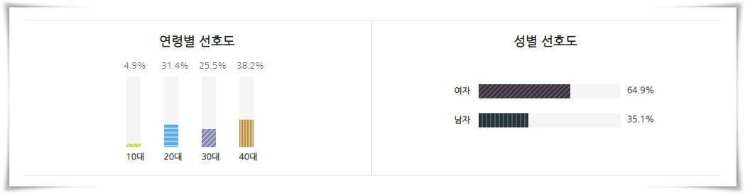 영화 엑시트 연령별 선호도를 살펴보면 의외로 40대에서 가장 많은 선호도를 보이고 있습니다. 남성 분들보다는 여성들이 65%로 극장을 찾고 있습니다.