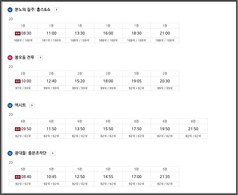 새로 개봉한 영화 이외에도 여전히 인기를 얻고 있는 분노의 질주, 엑시트, 봉오동 전투가 눈길을 끌고 있습니다.