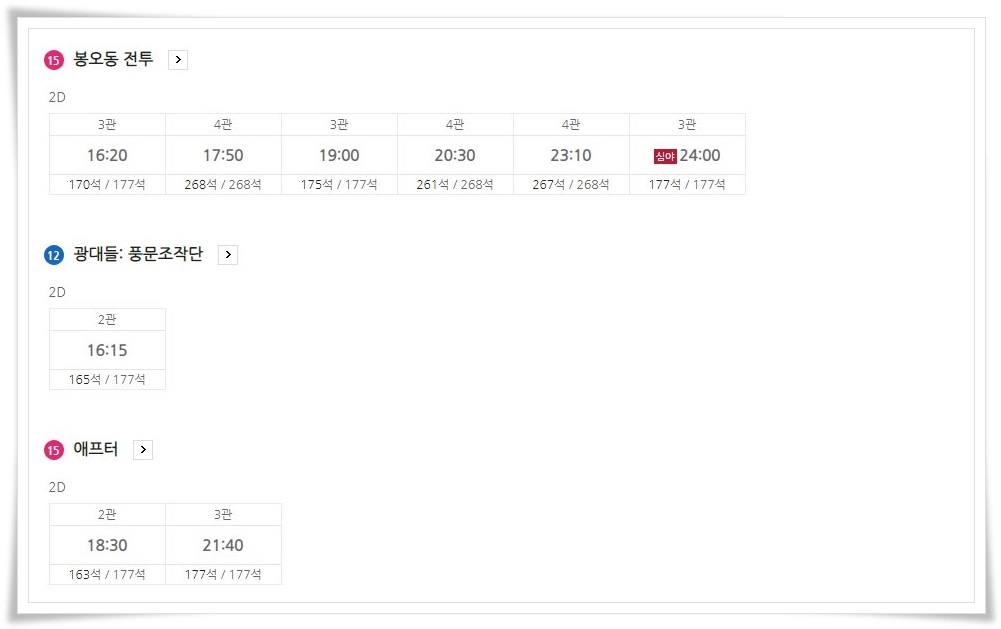 이외에도 다양한 영화들이 상영중인데요 오늘 기준의 서면 롯데시네마 상영시간표는 다음과 같으니 영화예매 시 참고하시기 바랍니다.