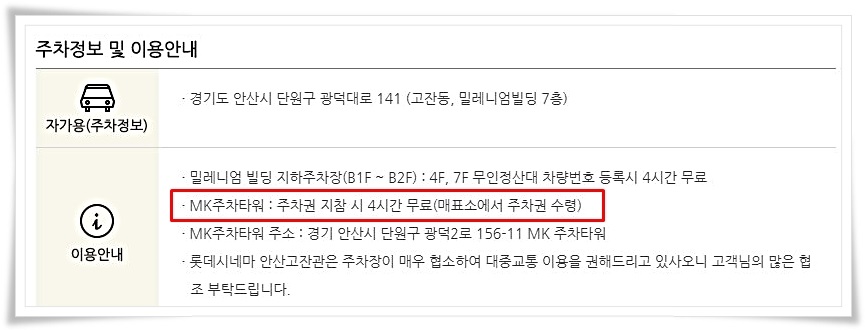 안산고잔 롯데시네마 주차요금의 경우 당일 영화 관람객들에게 4시간의 무료주차를 제공하고 있습니다. 영화예매 후 매표소에서 주차권을 꼭 수령하시기 바랍니다.