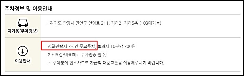 안양일번가 롯데시네마 주차장의 경우 지하 2층부터 5층까지 주차가 가능합니다. 영화 관람객들에게는 3시간의 무료주차를 제공하고 있으니 참고하시기 바랍니다.