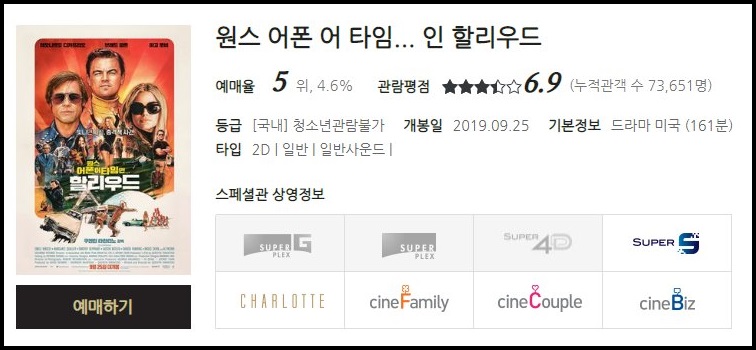 현재 예매순위를 살펴보면 1위 장사리, 2위 나쁜 녀석들, 3위 양자물리학, 4위 원스 어폰 어폰 어 타임 인 할리우드, 5위 애드 아스트라입니다. 브래드 피트가 출연하는 영화가 두 편이나 있는 것이 주목할 만 것 같습니다.