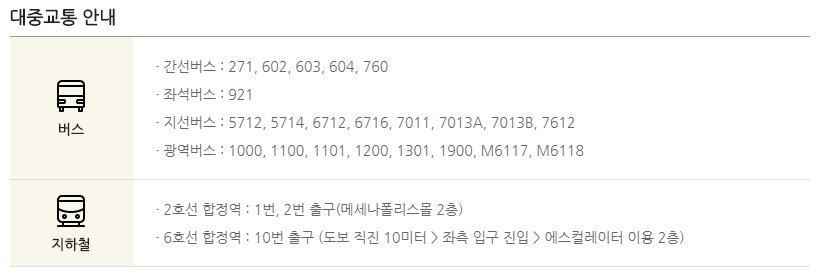 지하철 2호선 합정역과 연결되어 있어 대중교통을 이용하기에도 편리하며 많은 버스 노선도 운행하고 있습니다