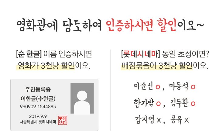 바로 한글 이벤트라고 합니다. 순수 한글 이름을 인증하면 3천 원 할인이 된다고 하니 롯데시네마를 이용하실 분들은 참고하셔도 좋을 것 같습니다.