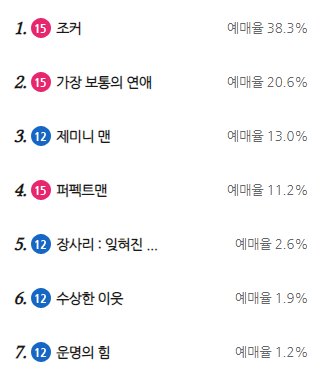 현재 순위를 살펴보면 최근 개봉한 영화들 중에서 조커, 가장 보통의 연애, 제미니 맨, 퍼펙트맨, 장사리 순으로 높은 예매율을 보이고 있습니다.