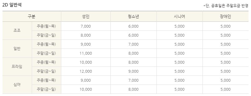 주중 요금과 주말요금이 다르게 적용되고 있습니다. 공휴일 또한 주말요금과 동일하게 적용되고 있는데요 주말 요금의 경우 11,000원입니다.