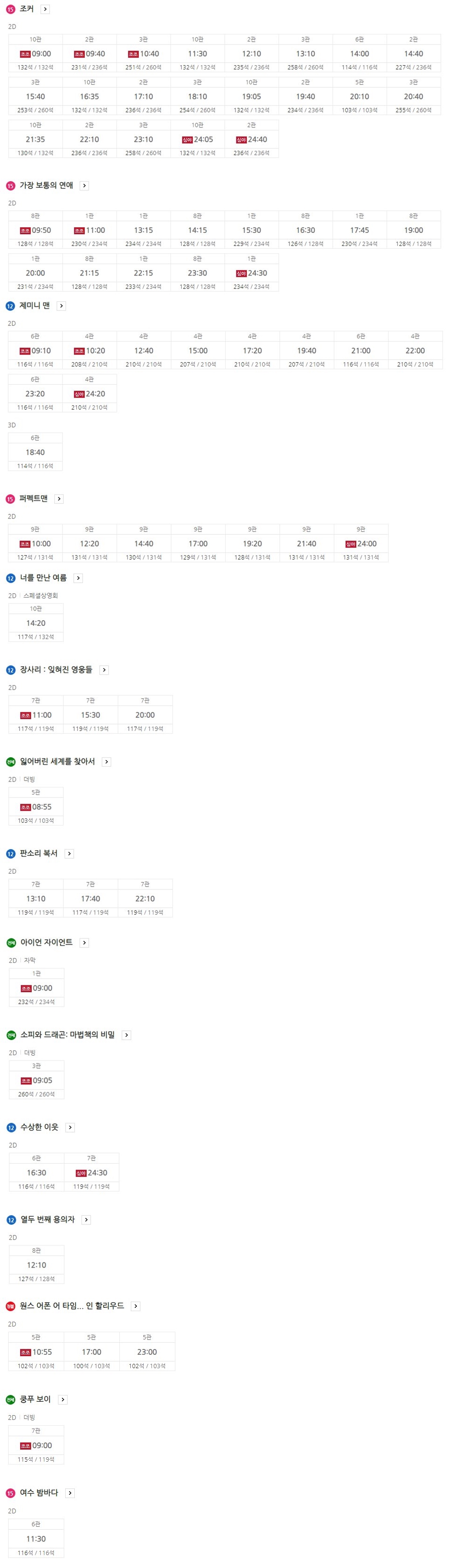 확실히 주말이라 그런지 15편의 다양한 영화들이 상영 중으로 소개되고 있습니다.