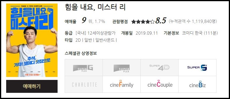 영화 예매순위 9위를 차지한 차승원 씨 주연의 영화 힘을 내요 미스터 리입니다.