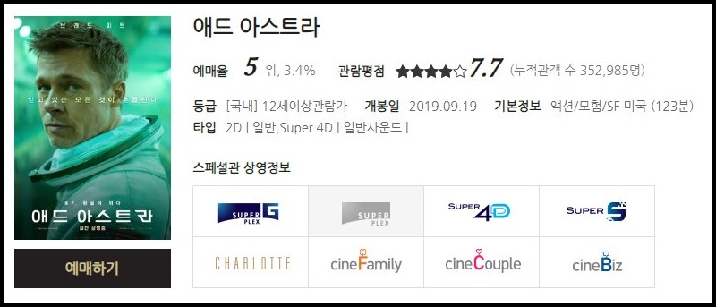 개봉 5일 차를 맞이하고 있는 애드 아스트라는 브래드 피트가 주연을 맡았습니다.