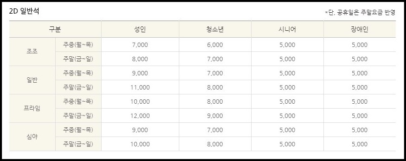 영화요금은 주중 요금 9,000원으로 주말 11,000원에 비하여 약 2,000원 정도 저렴한 편입니다.