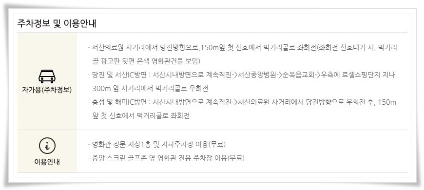 서산 롯데시네마 주차장은 영화관 정문에 있는 1층 주차장과 지하주차장을 이용할 수 있습니다. 주차요금은 무료이니 참고하시기 바랍니다.
