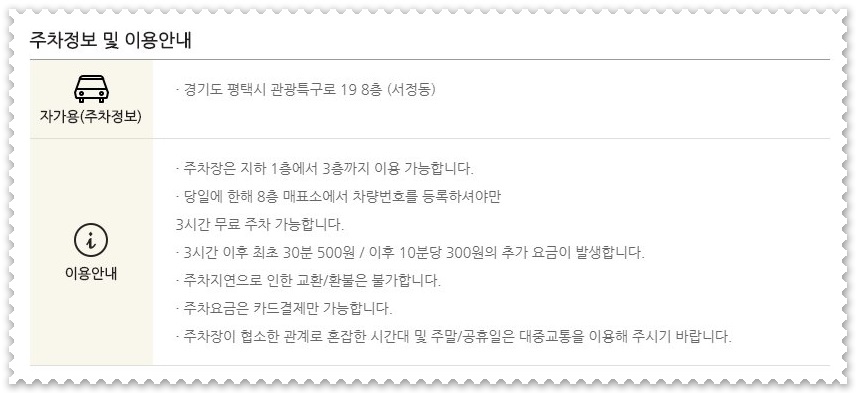 송탄 롯데시네마 주차장은 건물 지하1층에서 3층까지 이용할 수 있습니다. 주차요금의 경우 영화 관람객에게 3시간의 무료주차를 제공하고 있습니다.