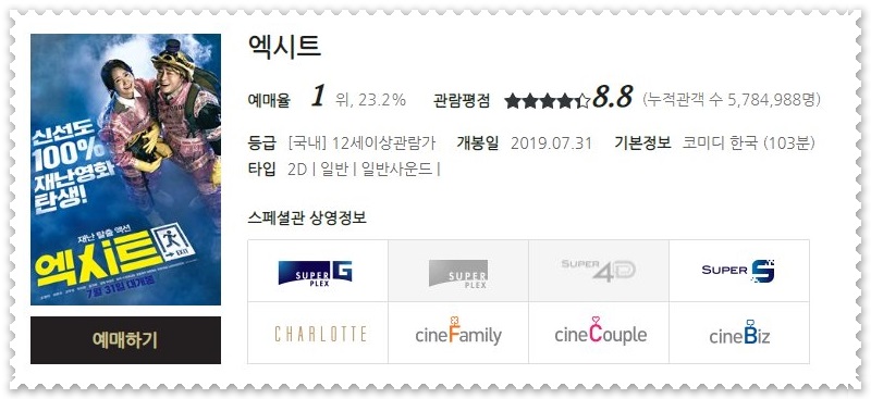 누적 관객수 570만 명을 넘긴 엑시트가 부동의 예매순위 1위를 달리고 있습니다.