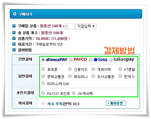 별풍선은 최소 10개 단위로 구매할 수가 있다고 합니다. 결제수단 또한 신용카드 및 포인트 결제, 간편 결제 등 대부분의 결제수단으로 가능한 것으로 나와있습니다.