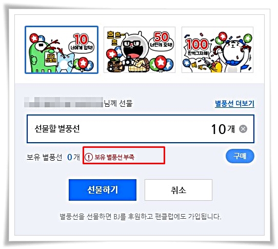 현재 실시간으로 방송중인 채널에 들어가 살펴보니 별풍선 선물 기능이 있었습니다.