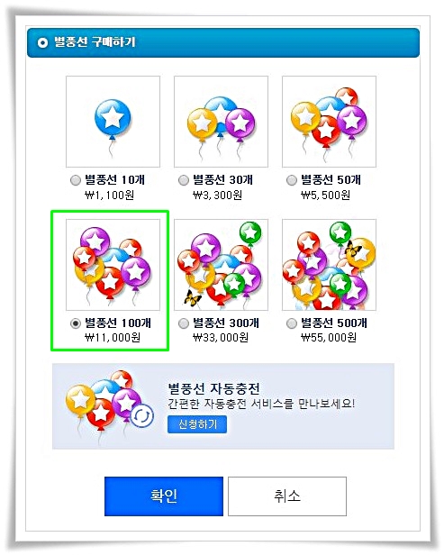 별풍선 구매는 30개, 50개, 100개, 300개, 500개 단위로 구매할 수가 있습니다. 또한 매월 정해진 날짜에 자동충전도 가능하다고 나와있습니다.