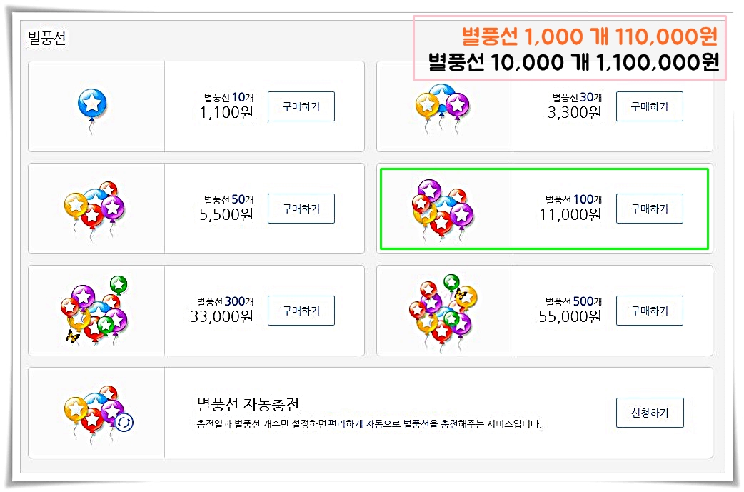 그럴 때마다 도대체 별풍선 1000개 가격이 얼마일까라고 많이 궁금해했는데요. 직접 결제 페이지로 접속해보니 별풍선 1000개는 110,000원이었습니다.