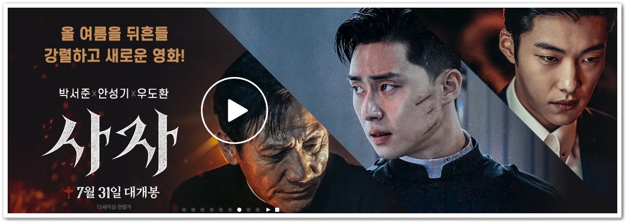 무더운 여름 역시 으스스한 공포영화가 제격인 법이죠. 사자는 퇴마를 주제로 만든 영화입니다. 구마 사제 안신부(안성기) 격투기 챔피언 용후(박서준) 두 사람이 검은 주교를 찾아 나서며 악을 무찌를 수 있을까요.