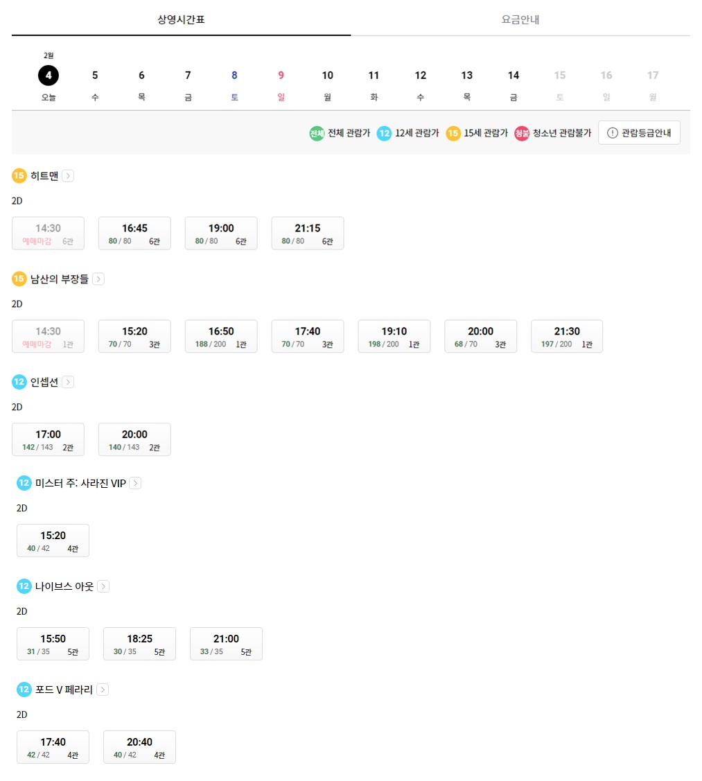영화예매를 하고자 한다면 관람일자별 시간표를 홈페이지에서 확인하시기 바랍니다.