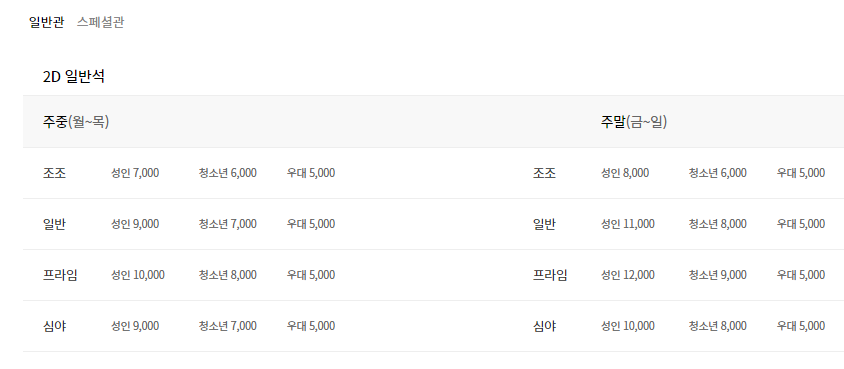 2D 영화 기준 주중의 경우 9,000원 주말요금은 11,000으로 안내가 되고 있으니 참고하시기 바랍니다.