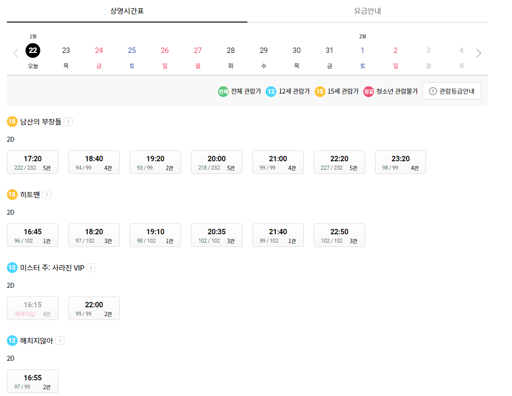 수락산 롯데시네마 상영시간표를 살펴보면 새로운 영화가 개봉하자마자 예매순위 1위에 올라있는 것을 알 수 있습니다.