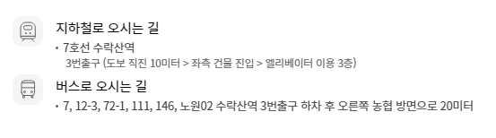 지하철뿐 아니라 대중교통을 이용해서 방문하기도 쉽습니다. 수락산역까지 운행하는 버스노선이 많이 있기 때문입니다.