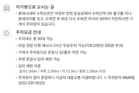 대부분의 영화관의 경우 무료주차를 제공하고 있습니다. 롯데시네마 수락산점을 살펴보면 당일 영화 관람 시 3시간의 무료주차를 제공하고 있습니다.