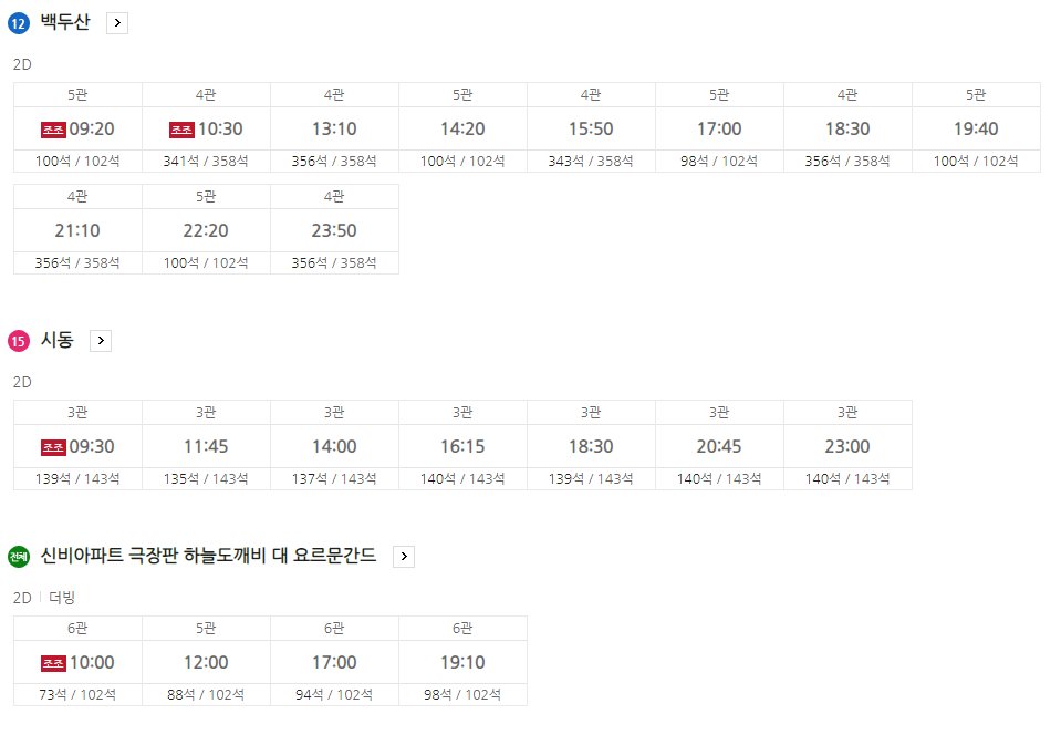 일요일을 맞이하여 총 5편의 영화가 상영 중으로 안내가 되고 있습니다. 최근 개봉한 백두산, 시동이 가장 많은 상영관을 차지하고 있는 것으로 보아 대세 영화가 아닐까 생각합니다.