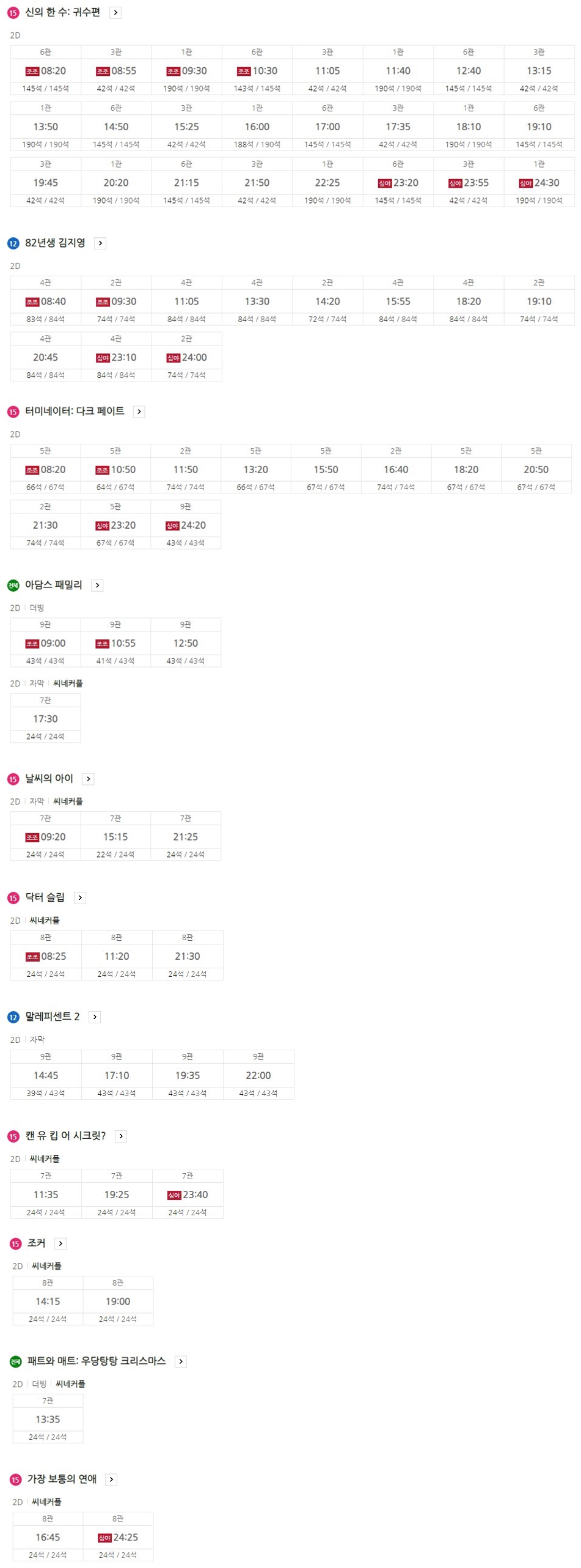 충장로 롯데시네마 상영시간표를 살펴보면 현재 상영작 중에서 신의한 수, 82년생 김지영, 터미네이터 다크 페이트 등이 예매순위 1~3위에 올라 있습니다.