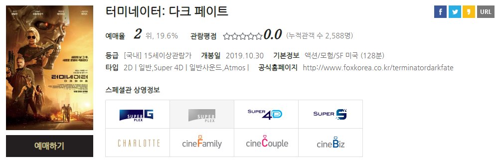 어제 개봉한 터미네이터 다크 페이트 또한 영화예매 순위 2위에 올라있는 영화입니다.