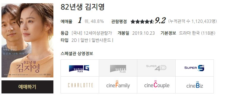 롯데시네마 영화예매 순위를 살펴보면 현재 개봉 이후 가장 많은 관심을 받고 있는 영화가 바로 82년생 김지영입니다.