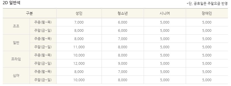 일반석 기준 주중 요금 및 주말요금입니다. 주중 요금의 경우 8,000원 주말 요금은 11,000원입니다.