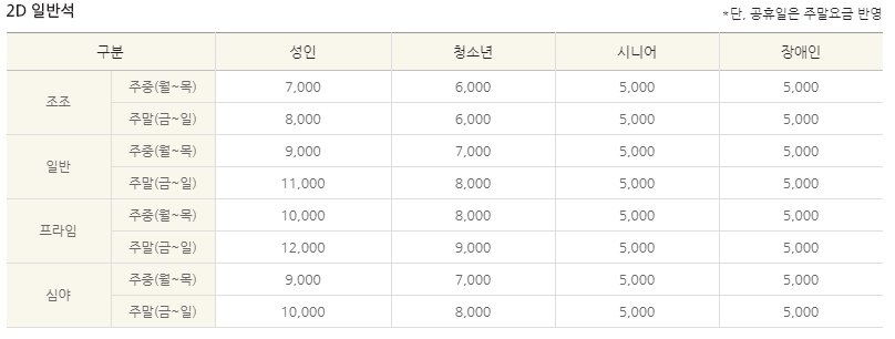 롯데시네마 관람요금을 살펴보면 주중 및 주말 요금이 다르게 책정되어 있습니다.