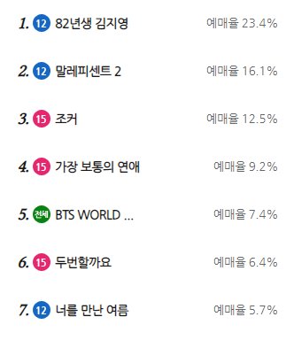 이럴 때 박스오피스 예매순위를 참고하 시근 것도 좋을 것 같습니다.