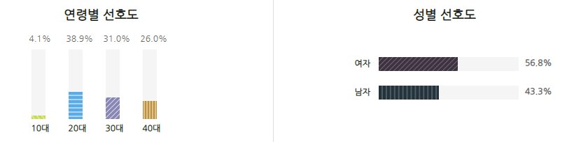 성별 선호도를 살펴보면 여성분들이 남성들보다 더 많은 선호를 하는 것으로 나타나 있습니다.